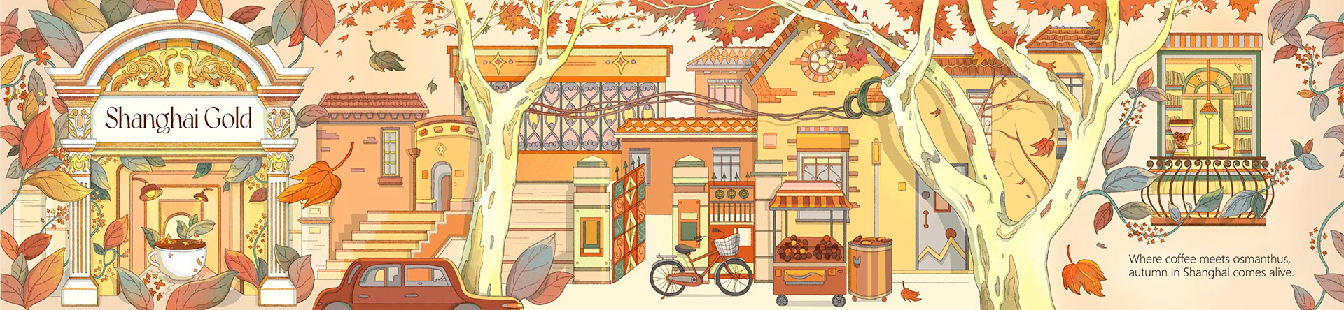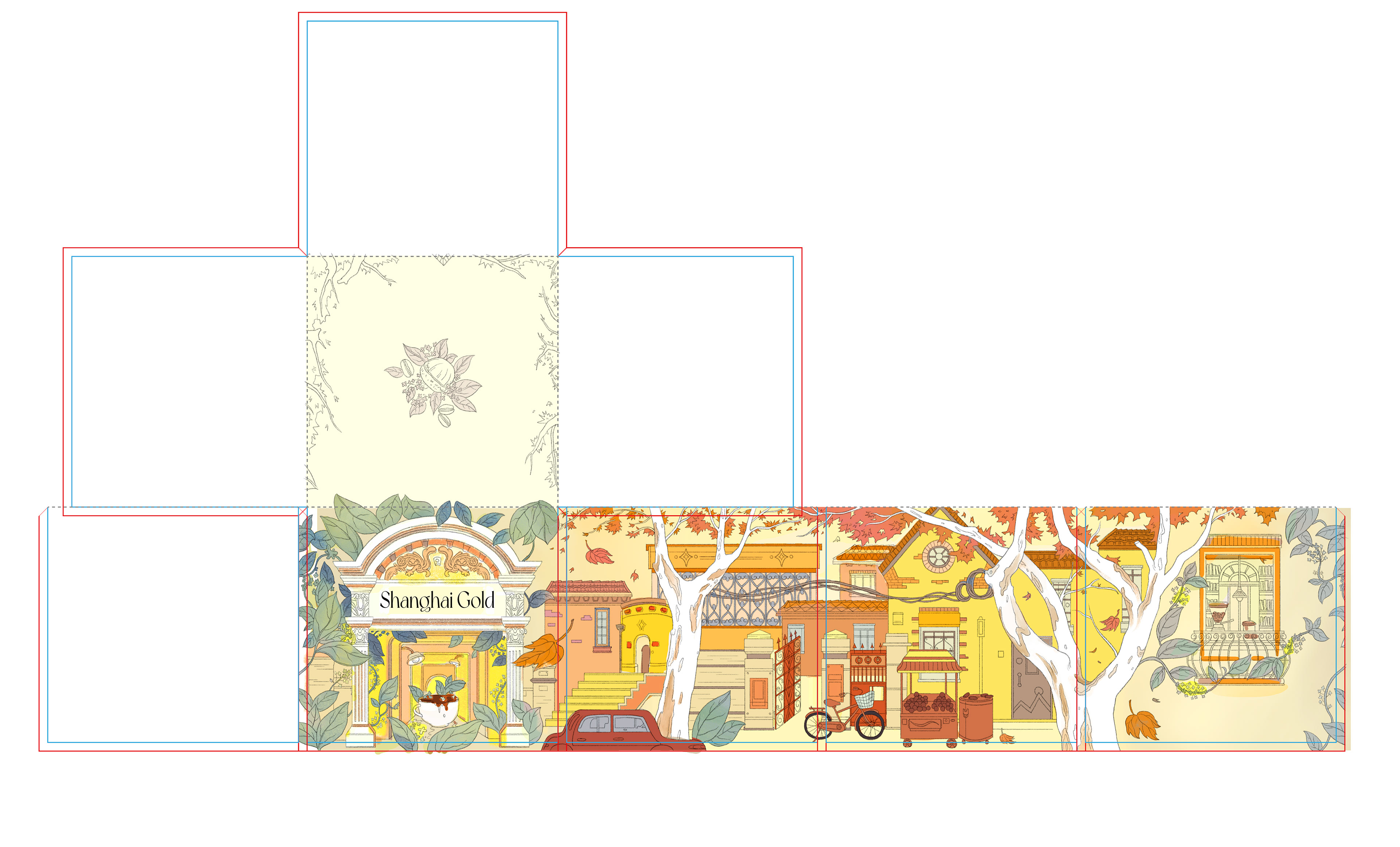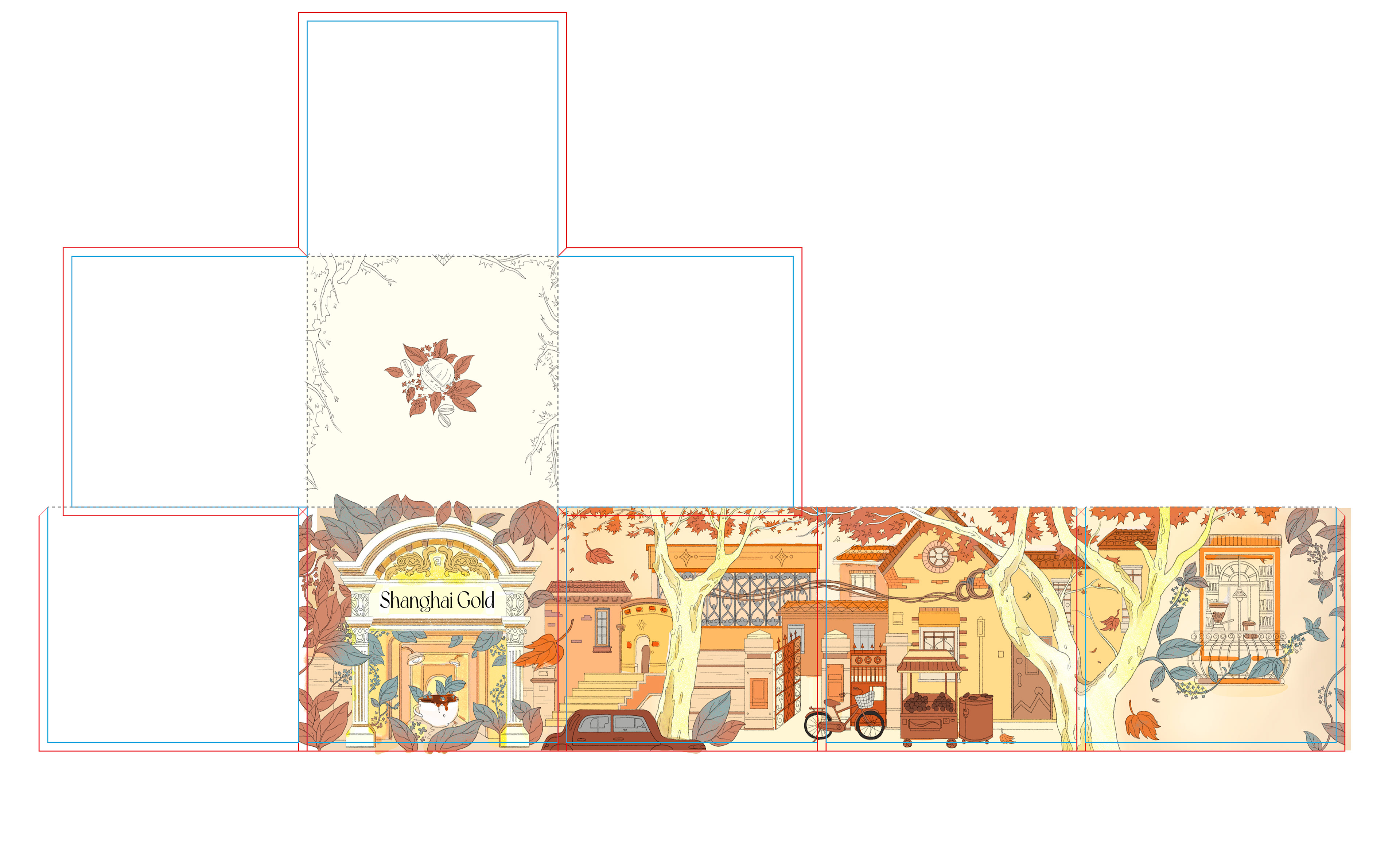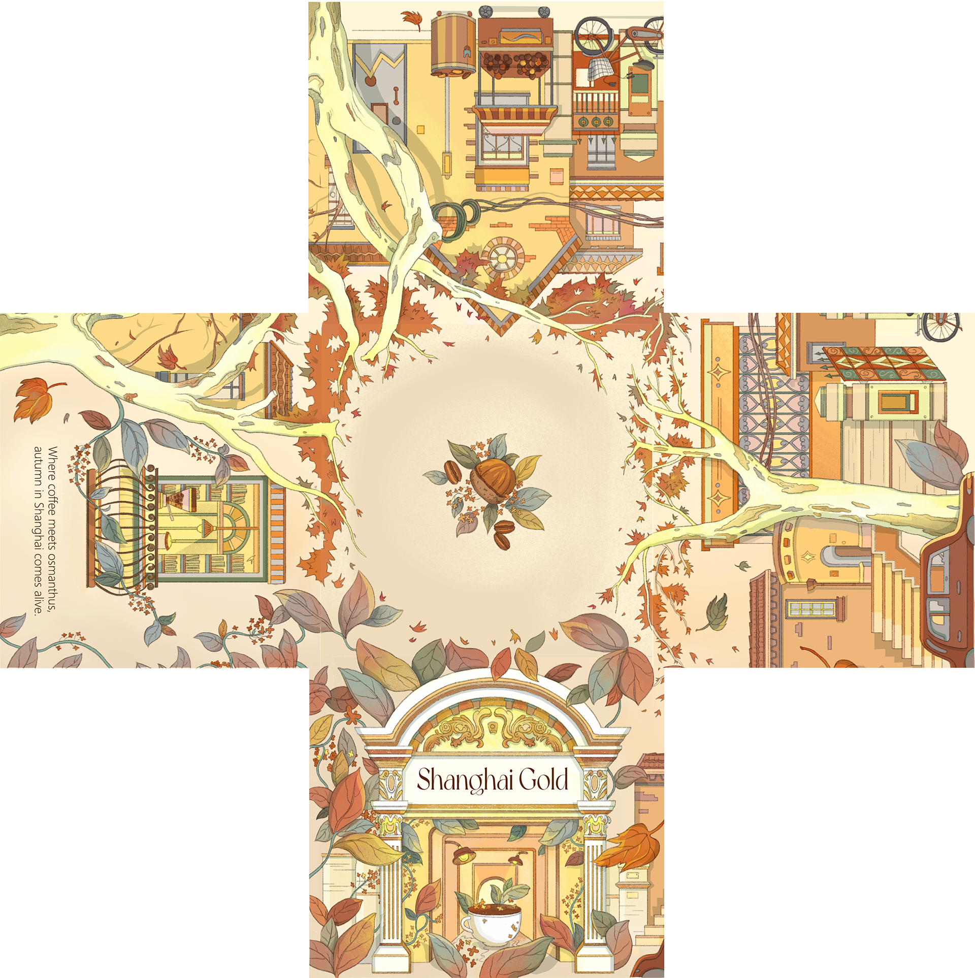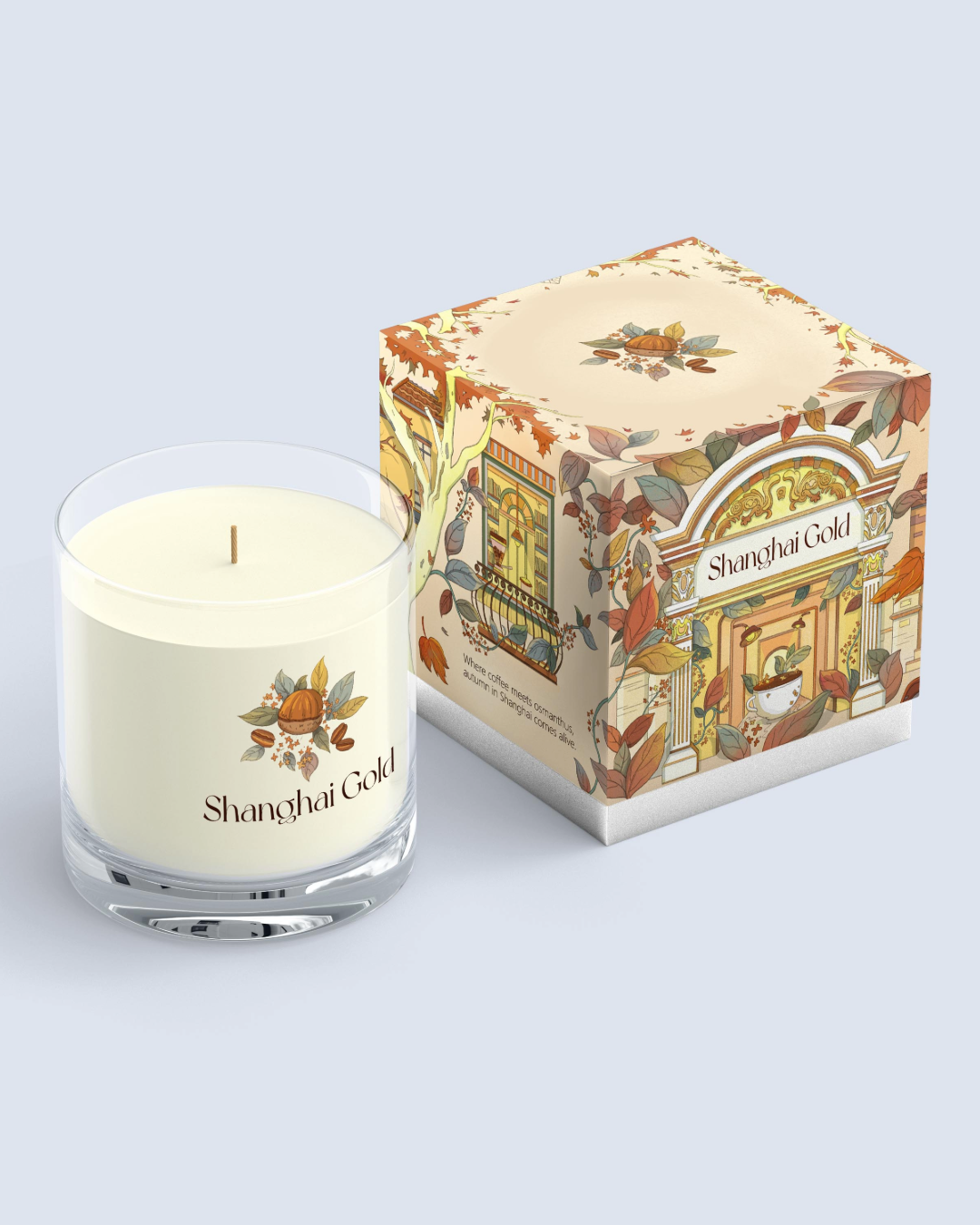 A luxury candle packaging design dedicated to my hometown, Shanghai. When autumn comes to Shanghai, the air is rich with coffee, osmanthus, and roasted chestnuts. Walking under the plane trees, the warmth and scent of the city feel so familiar. Light this candle to bring a little of that Shanghai autumn home.